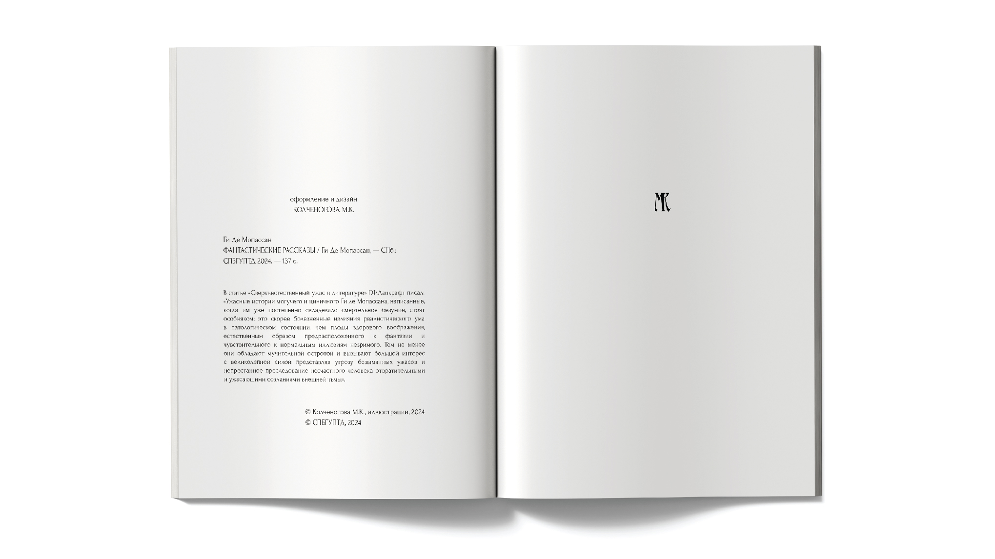 В рамках данного проекта была осуществлена подготовка верстки и иллюстраций для сборника фантастических рассказов выдающегося французского писателя Ги де Мопассана. Были разработаны мрачные иллюстрации, которые словно растворяются в страницах книги, создавая эффект погружения в мир фантазий и тревожных сновидений. Они отражают ключевые моменты рассказов и передают их атмосферу, позволяя читателю еще глубже ощутить магию и мрак фантастического мира Мопассана.
