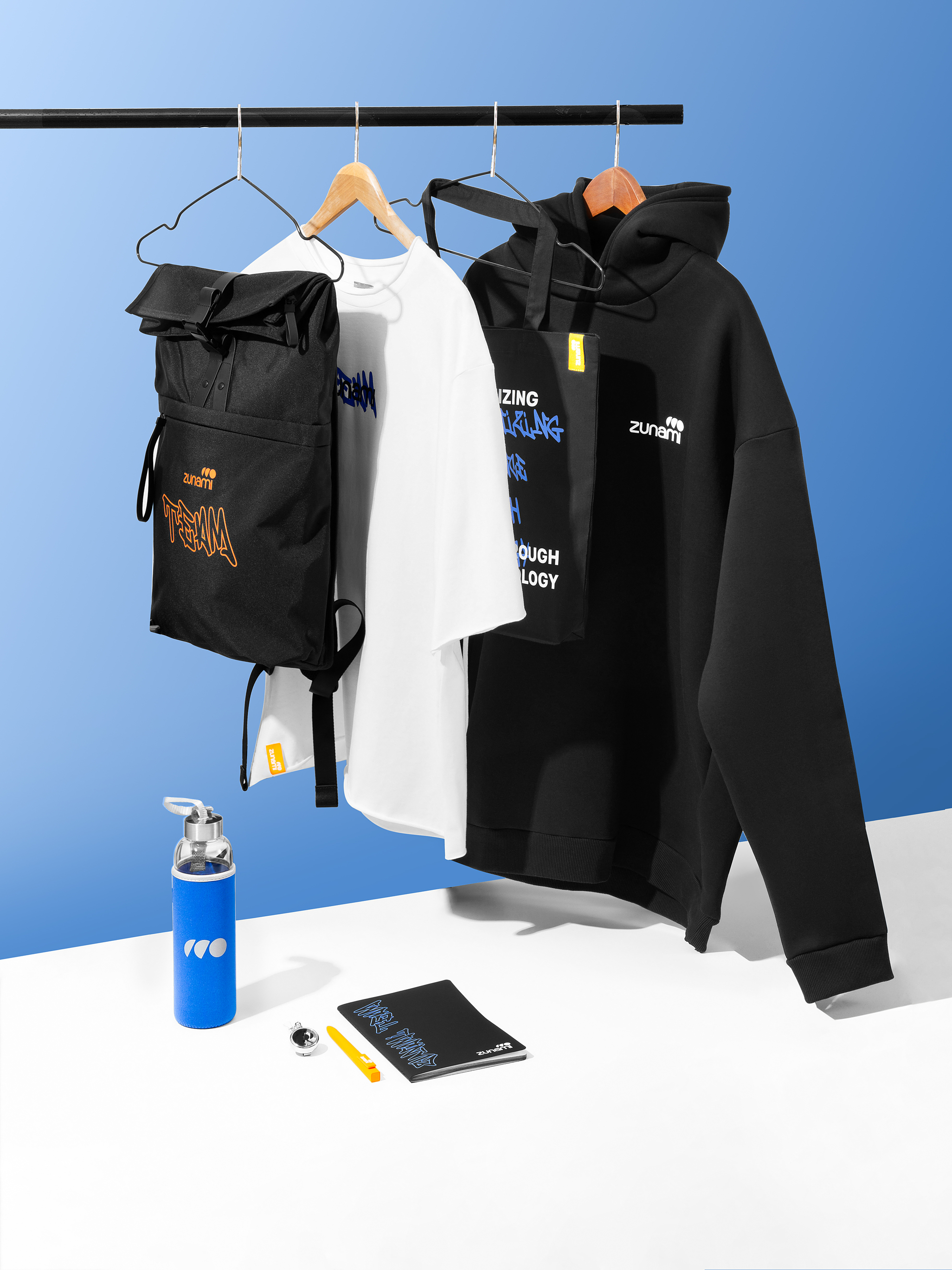 IT-компания Zunami обратилась к нам за подарками для сотрудников: для новичков и для опытных, проработавших в компании 7+ лет. Запрос клиента состоял в создании мерча и подарков в лаконичном дизайне, в современном стиле и по брендбуку. С самого начала мы предложили немного разбавить сдержанный фирменный стиль и добавить в дизайн граффити, делая отсылку к свободе, молодости и дерзости (Zunami предлагает инновационные IT-решения в сфере страхования), а также сделали упор на черный цвет как на самый универсальный и любимый айтишниками. Клиент предложение принял, и мы продолжили работу над проектом.
